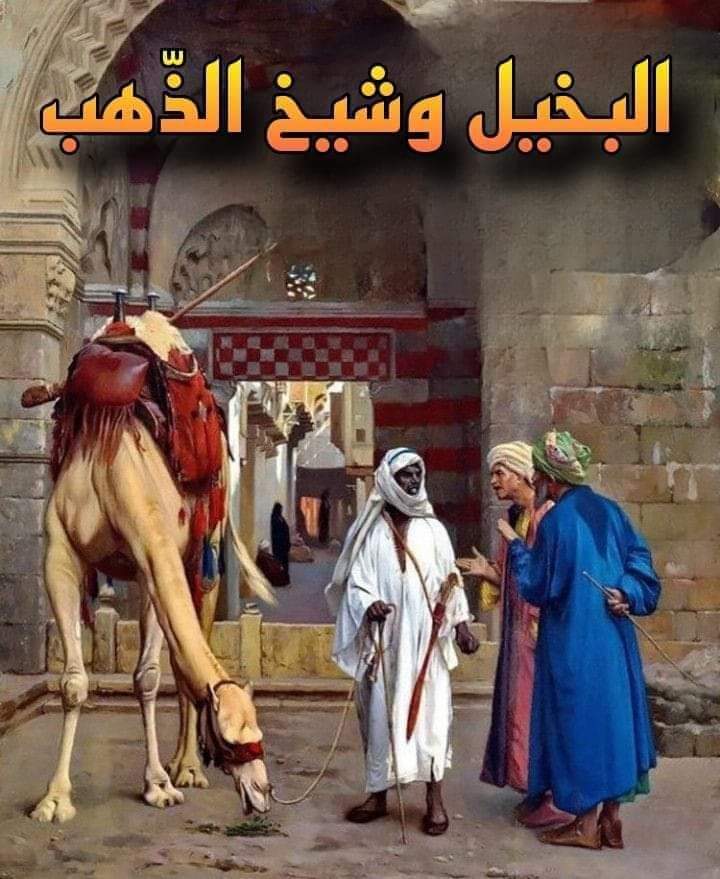 البخيل_وشيخ_الذهبي حكى عن رجل شديد البخل إسمه عمير كان يقتر على نفسه إلى درجة أنه يأكل حبة الزيتون على ليلتين ليلة يأكل نصفها مع ربع خبزة والليلة الثانية مع شيئ من بصل وخل .كان لا يشبع من الطعام وما يربحه في السوق من حمل البضائع على ظهره يخفيه في جرة وكل يوم يفتحها ويعد من فيها من قطع فضية .في أحد الأيام ماټ عمه وورث منه أربعة جمال ولم يكفيه ذلك فأخرج ما أخفاه من مال وإشترى جملا خامسا وفي ذلك الوقت كان التجار يأجرون الإبل لتحمل بضائعهم من مدينة إلى أخرى ولما تصل لوجهتها يأخذ صاحبها أجره وإشتغل ذلك الرجل بجماله الخمسة وكان حريصا على إيصال البضائع بسرعة لكي يكسب أكثر وهو لا يرتاح ودوابه تغاني من الجوع والإنهاك الشديد .ذهب زمان وأتى زمان وإشتهر أمره بين التجار وصار يمضي كامل وقته وهو يتنقل من مكان إلى آخر وكلما وصل مدينة يذهب إلى الجامع ويتغدى من صدقات الناس لكي لا ينفق درهما واحدا .وفي الليل ببيت قرب إبله على كومة قش . ثم إشترى بما جمعه جملا سادسا ولما يدخر شيئا يشتري به جملا آخر و تضاعفت أرباحه زاد عدد جماله حتى بلغ ثمانين من الإبل وأصبح الناس ينادونه سي عمير ورغم أن الله أعطاه خيره إلا أنه لم يتغير لا في هندامه ولا في مأكله . وكثيرا ما نصحه أهله بالتفكير في نفسه والبحث عن زوجة جميلة إلا أنه إزداد جشعا وتقتيرا ولم يقبل حتى بأجير يساعده في شحن البضاعة والسفر معه وأصبح يفتح بضائع التجار ويأكل منها وإذا صرف درهما مرض عليه أحد الأيام كان مسافرا بأحمال من القمح والتمر فجاع وفتح الأكياس وأخذ منها ما يكفيه ثم أغلقها وأرجعها كما كانت عليه .قلى القمح على الڼار ثم دقه بحجر وصب عليه الماء حتى أصبح مثل السويق وأكله مع التمر . بينما هو كذلك رأى شيخا ذو لحية بيضاء يقترب منه وقد ظهر عليه الجوع والتعب كره أن يدعوه إلى طعامه القليل فأدار ظهره لكي لا يراه يأكل لكن الشيخ كان عنيدا وأتاه من الجهة الأخرى وقال له السلام عيكم فلم يجبه عمير فجلس ومد يديه للصحفة وقال إكرام الضيف واجب !!! فأحس الجمال باالغيظ و قال في نفسه لقد تعبت لإحضار طعامي وهذا اللعېن جاء ليقاسمني فيه نظر الشيخ إليه ورأى عدم الرضى في عينيه فقال الرزق رزق الله وما قيمة ما ما تملك من إبل أمام خزائن السماء !!! علم نفسك الكرم وسيزيدك الله من خيره رد عليه ومن أنت حتى تنصحني أليس الأجدر أن تبدأ بنفسك حتى يعطيك الله جملا واحد على الأقل تركبه !!! ضحك الشيخوقال له لو علمت ما عنديمن رزق لأصاب رأسك الدوار .واصل الشيخ الأكل وعمير ينظر إليه ويتساءل عن ماذا يتكلم هذا الرجل فلا أرى عنده شيئا ولا حتى عنزة صغيرة .لما أتم الشيخ الطعام مسح يديه وشفتيه وقال لقد أصبح بيننا ماء وملح وأريد أن أجازيك على معروفك وأقودك إلى كنز لا يعرفه من الناس سواى !!!سأله عمير بإستغراب أنت أجابه الشيخ نعم أنا ثم قال له أخبرني أيهم أفضل عندك جمل واحد عليه جرابان من ذهب أم تسعة وسبعون رد عمير طبعا الجمل الذي يحمل الذهب قال الشيخ إتفقنا إذا والآن هيا إتبعني وأوصيك أن تحمد الله على ما أعطاك …سار عمير وراء الشيخ حتى وصلا إلى مكان مقفر مليئ بالخرائب والأعمدة ثم إلتفت حوله وقال أين الكنز لا يوجد هنا إلا البوم طلب منه الشيخ أن يسكت ويساعده في جمع الحطب ثم أوقد ڼارا ورمى عليها بخورا من صرة صغيرة كانت في حزامه وبدأ يهمهم ويعزم .بعد قليل إنشقت الأرض وظهرت حفرة فيها مدرج فقال له الشيخ إنزل وسط الحفرة وأخبرني عن ما تراه هناك !!! لما وصل عمير إلى القاع أشعل عودا من الحطب ومشى قليلا ثم توقف وقد علت وجهه الدهشة . لقد كان هناك أكوام من الذهب والجواهر والسيوف المرصعة بالياقوت فاحتار في أمره ولم يصدق عينيه وأخذ يدور ويتفرج على النفائس وكلما هم بالصعود رجع يجري فلقد كان هناك عدد لا يحصى من الأشياء وكل ما هناك من المرايا والأكواب والصحون هي من الذهب والفضة ناداه الشيخ وقال يجب أن نحمل الجمال بسرعة وإلا إنغلق باب الحفرة ولا يمكننا فتحه !!! أخبرني بربك ماذا أفعل ببضاعة التجار وفيها الدقيق والتمر أجاب ع
